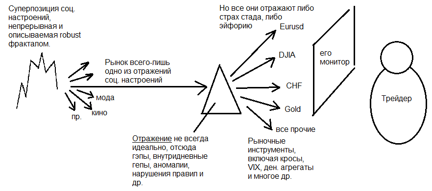 Как в этой аналогии выглядит торговля в начале XX века и сейчас? Разница только в картинке, то есть в вашем отражателе матча. Вначале телетайп, радио, потом черно-белый ТВ, потом цветной, потом LCD мониторы и, наконец, ультра 4k панели с объемным звуком. Вы видите больше деталей, улучшается качество отображения, но сам матч продолжает идти на стадионе. Раньше было больше помех на изображении, тоже самое будет и на малоликвидном рынке. Цена — это отражение social mood, и у отражения есть качество.
