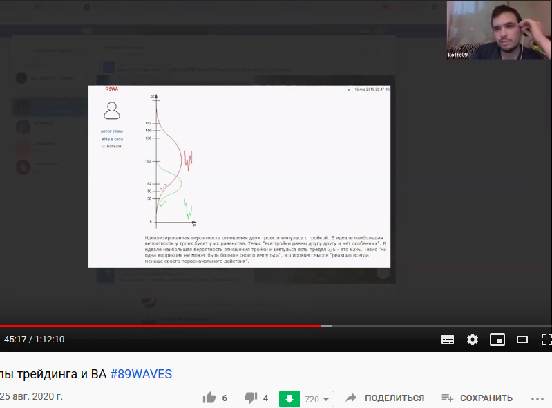 и размещалась на моей ресурсе pr0.mybb.ru 16 января 2018 года. Данная работа позволяла улучшить ценовое прогнозирование. В нарушение установленных мной правил копирования и распространения, канал, автор которого, возможно, похож на учредителя ООО «ВЭЙВС», вторично монетизировал и распространял моё ноу-хау без указания автора и источника информации. Я зафиксировал этот видео-кадр на временной отметке 45:17. Видео будет в приложении к заявлению.