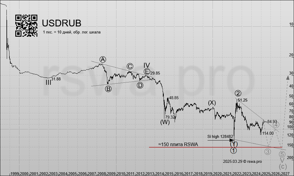 11 сентября 2011 года впервые был построен трехвековой график USDRUB. Вначале в номинальных значениях, а затем из котировок исключил деноминации, так как они не отражали social_mood. Это позволило впервые увидеть глобальную волновую картину по России вне зависимости от политических укладов и денежных систем. График USDRUB построен так, что вверху у него позитив, а внизу негатив. Все волны идущие вверх завершаются позитивом в России, а те, что идут вниз, привязываются к негативным событиям. Чем больше степень волны, тем масштабнее положительное/отрицательное. Завершение волны — это расцвет Российской Империи с максимальной площадью владений. Финал (a) приводит к Великой Отечественной Войне, финал (b) — тот самый период могущества СССР, о котором многие вспоминают. Сейчас завершается волна (с), и страна вновь в противостоянии с мировым Злом.