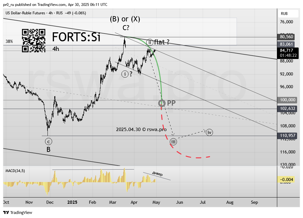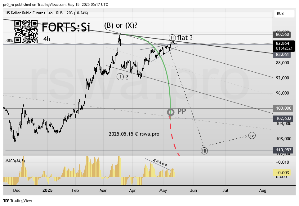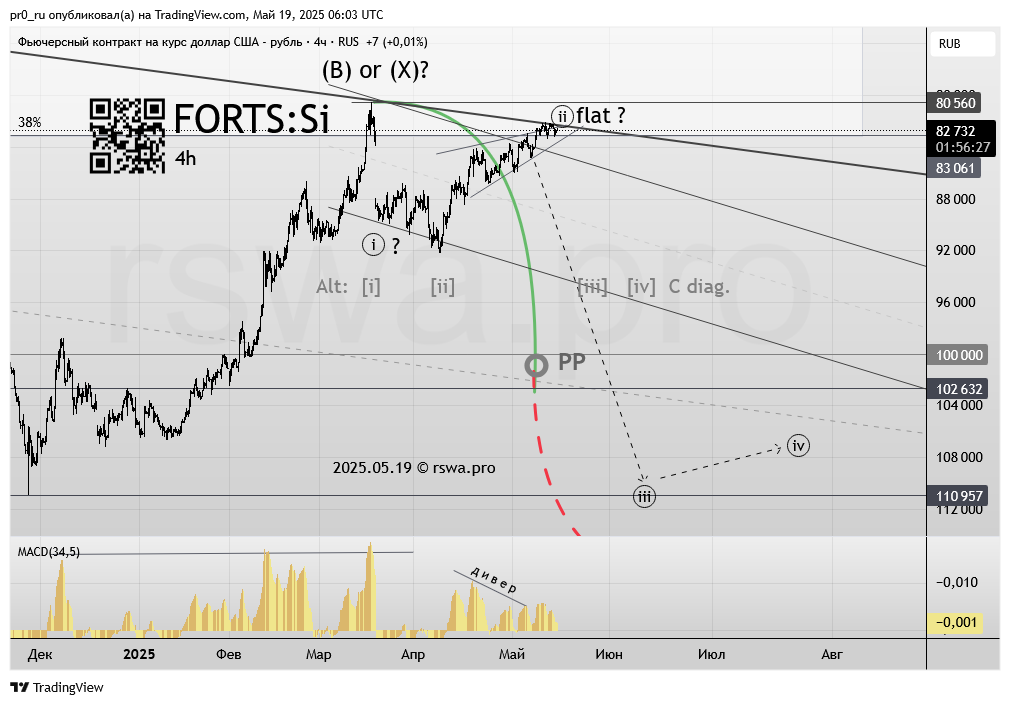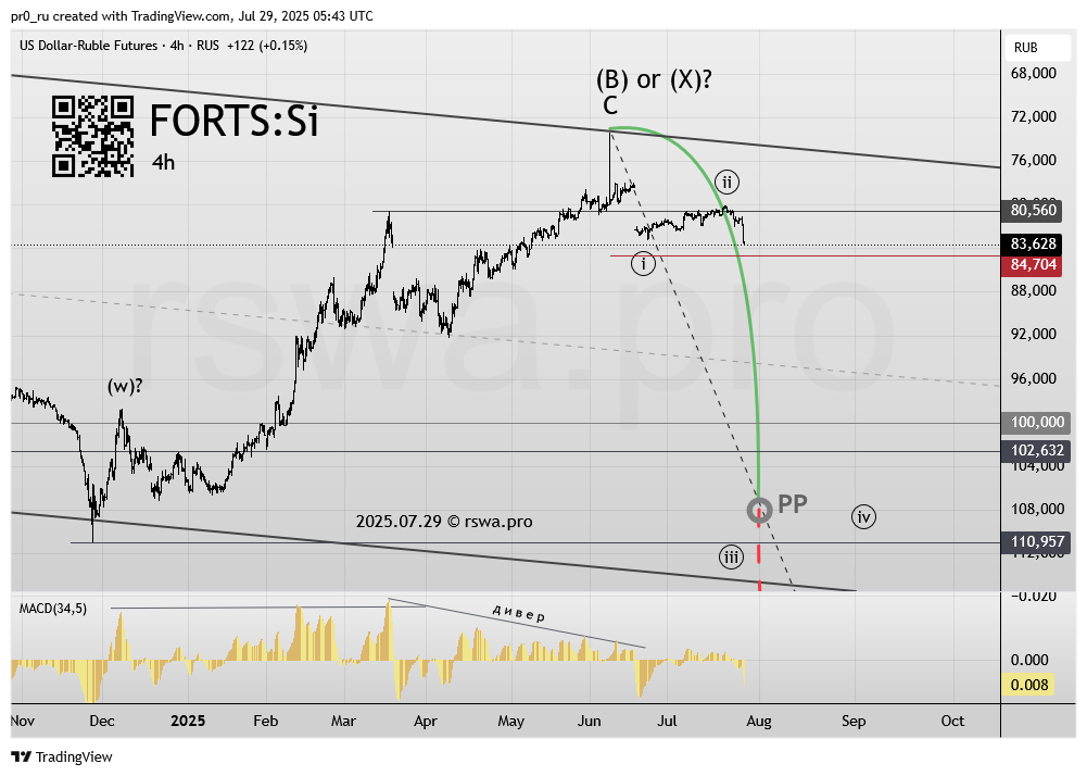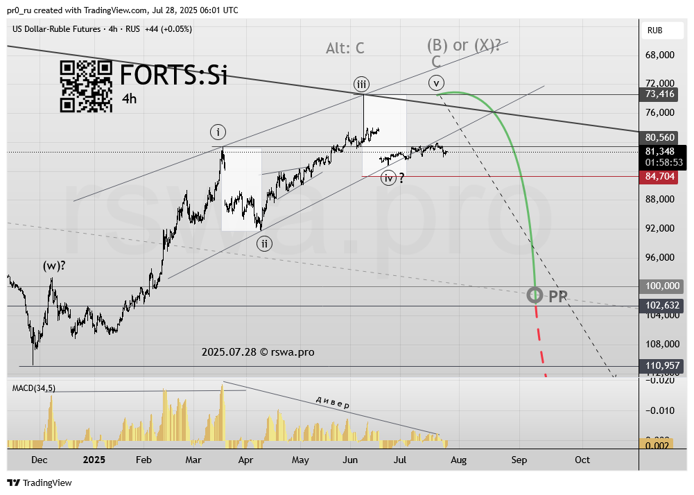 2025.06.10 09:01 20250714si4h.png Технически завершенную диагональ С уже можно натянуть, если учитывать шпильку. В альтернативе еще затягиваем время и формируем участок [iv] - [v]. В любом случае, узнаем о развороте рубля первыми, т. к. в диагонали не может быть коррекции больше второй волны (участки выделены прямоугольником).