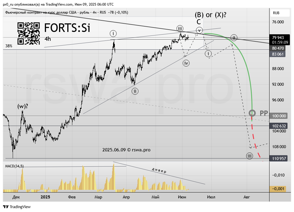 2025.06.09 09:02 20250609si4h.png диагональ волны С не отменяет все ранее написанное, а лишь сдвигает по времени, затягивает. У диагонали будут два близких максимума и большая дивергенция на MACD. Это лучшее время уйти из рубля в валюту, особенно из бетона.
