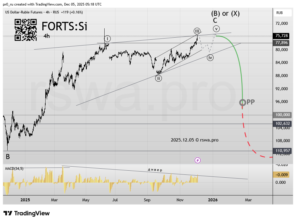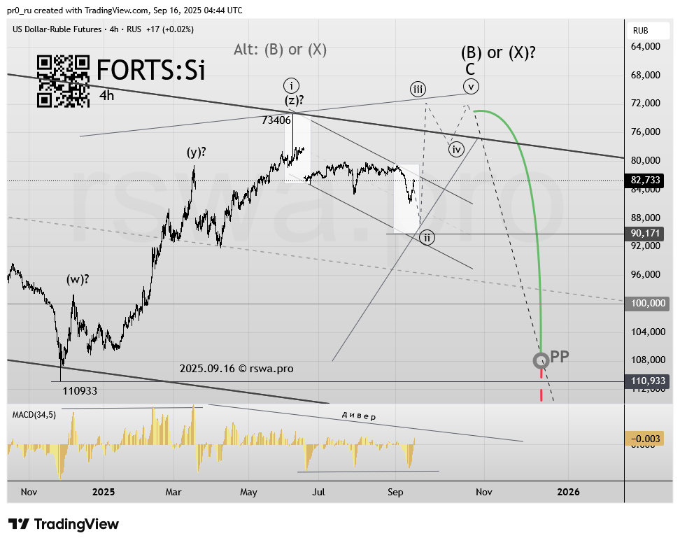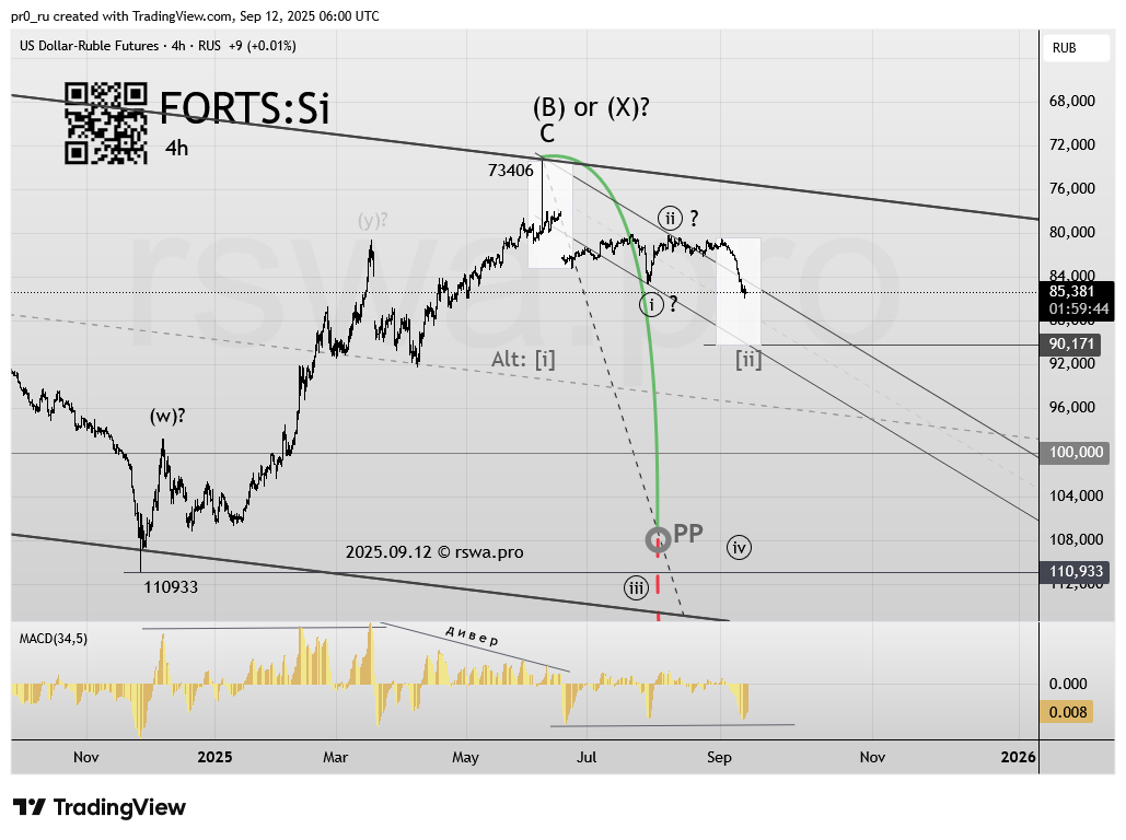 2025.07.31 09:01 20250912si4h.png рубль волной [iii] должен пробить нисходящий канал с ускорением и "обосновывающей" новостью/событием, образовать экстремум на MACD. Если он этого не сделает и будет подползать к краю канала с затуханием, топтаться возле края, образуя зигзаг, то теоретически вновь возможен перехай локального укрепления. Для подтверждения каунта вниз важно увидеть развитие импульса основного сценария.